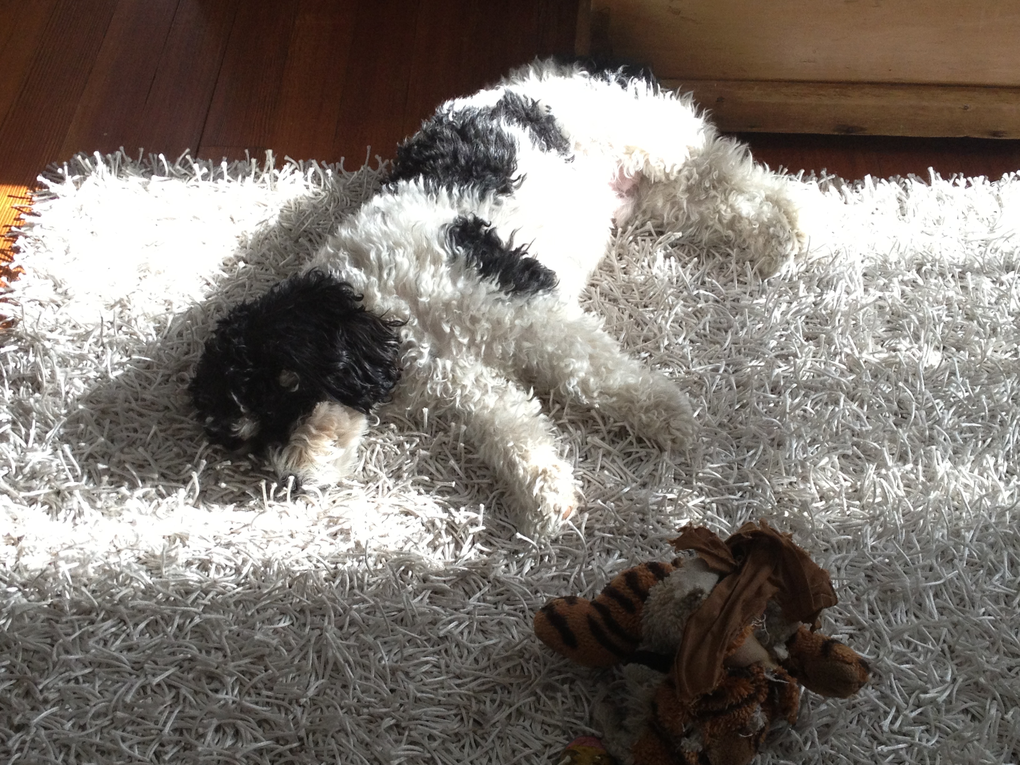 Riley, my boy (with Tiger, the mangled, blind, de-sqeaked stuffed animal who he has had since he was a two months old) illustrating exactly how I feel about this fucking snow.