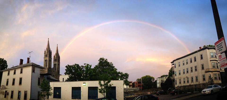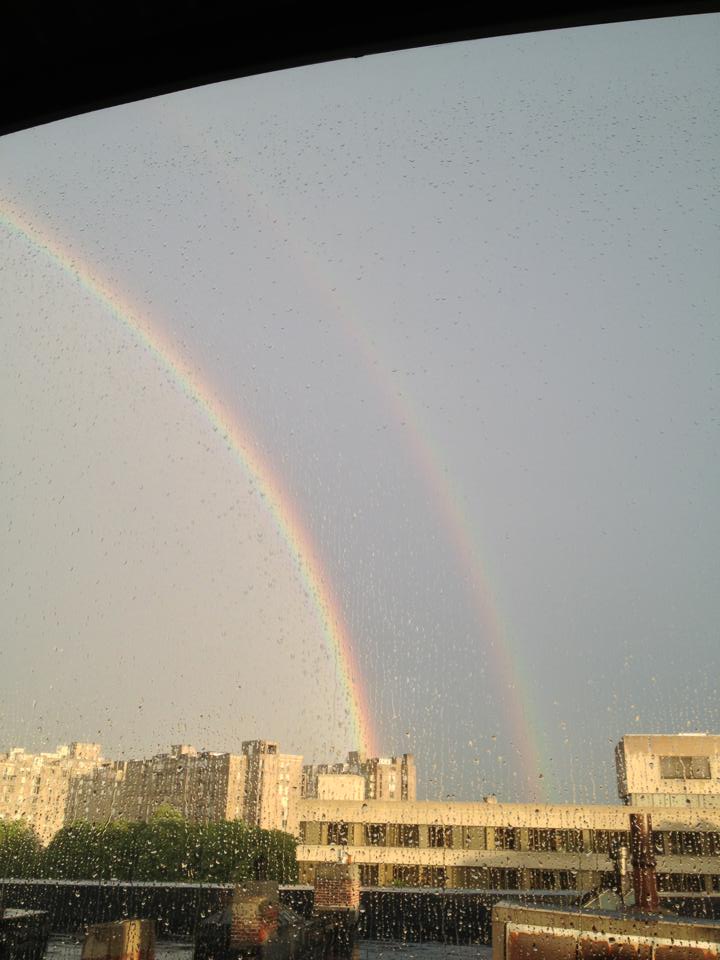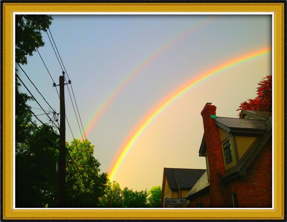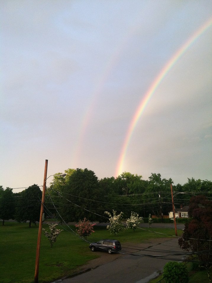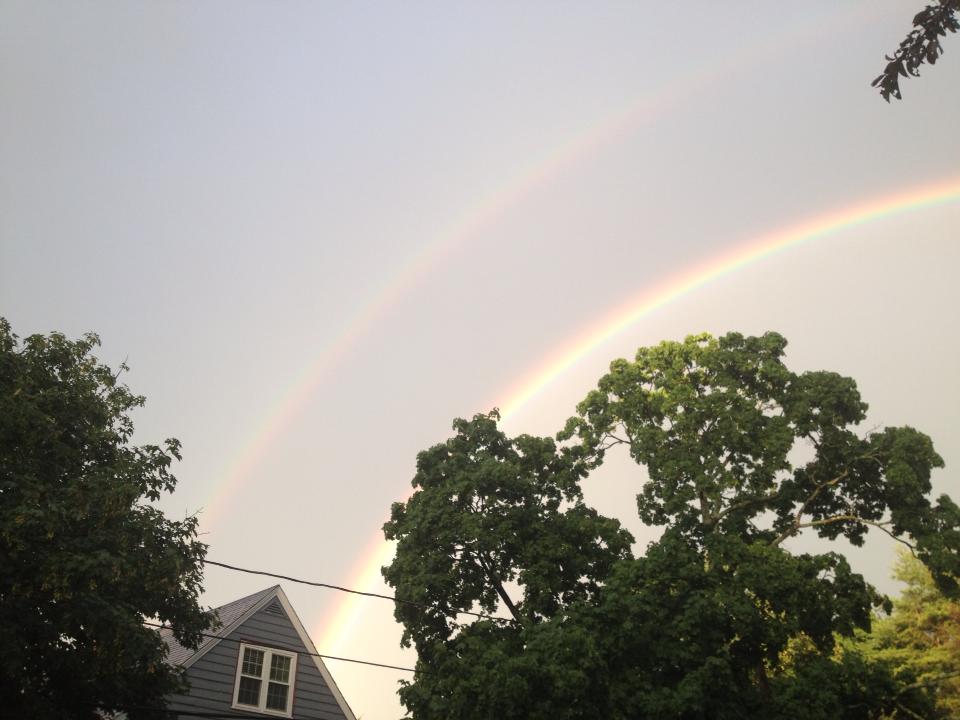 Anyway, as we were watching, Ally was, as usual, on her phone checking Facebook. She announced there was a double rainbow. I didn’t immediately get up to look, because I figured if it was on Facebook, it probably wouldn’t still be out there, but no slouch on the Facebook front myself, I clicked in too, and within literally seconds, the whole page filled with pictures of the rainbows. Ally and I ran outside and caught one, although it was quickly fading and too light to capture on our phones. So, today, the gratitude-a-thon is stealing some of those amazing rainbow photos to share. Because, as good as The Departed was, double rainbows are even better.
