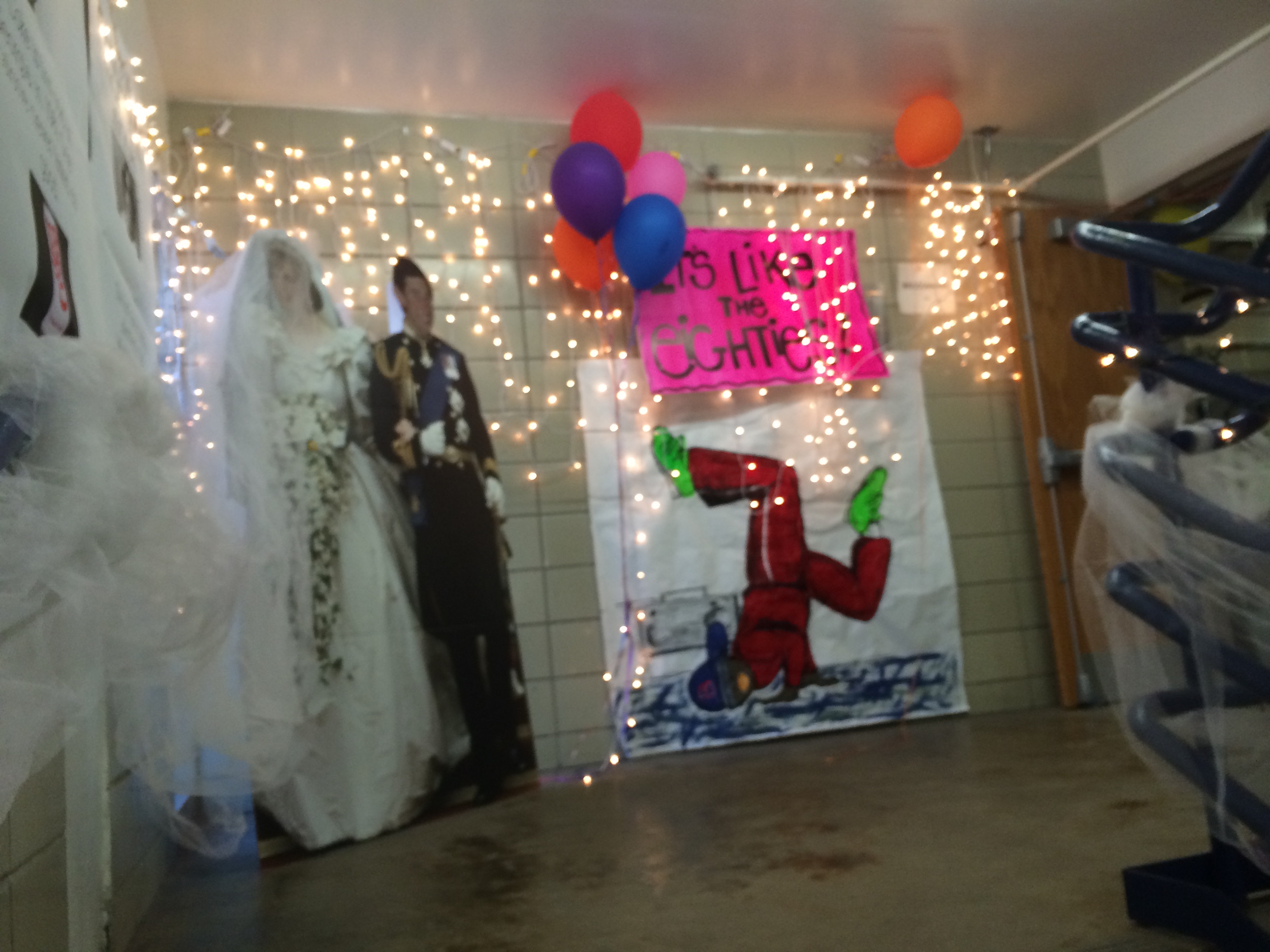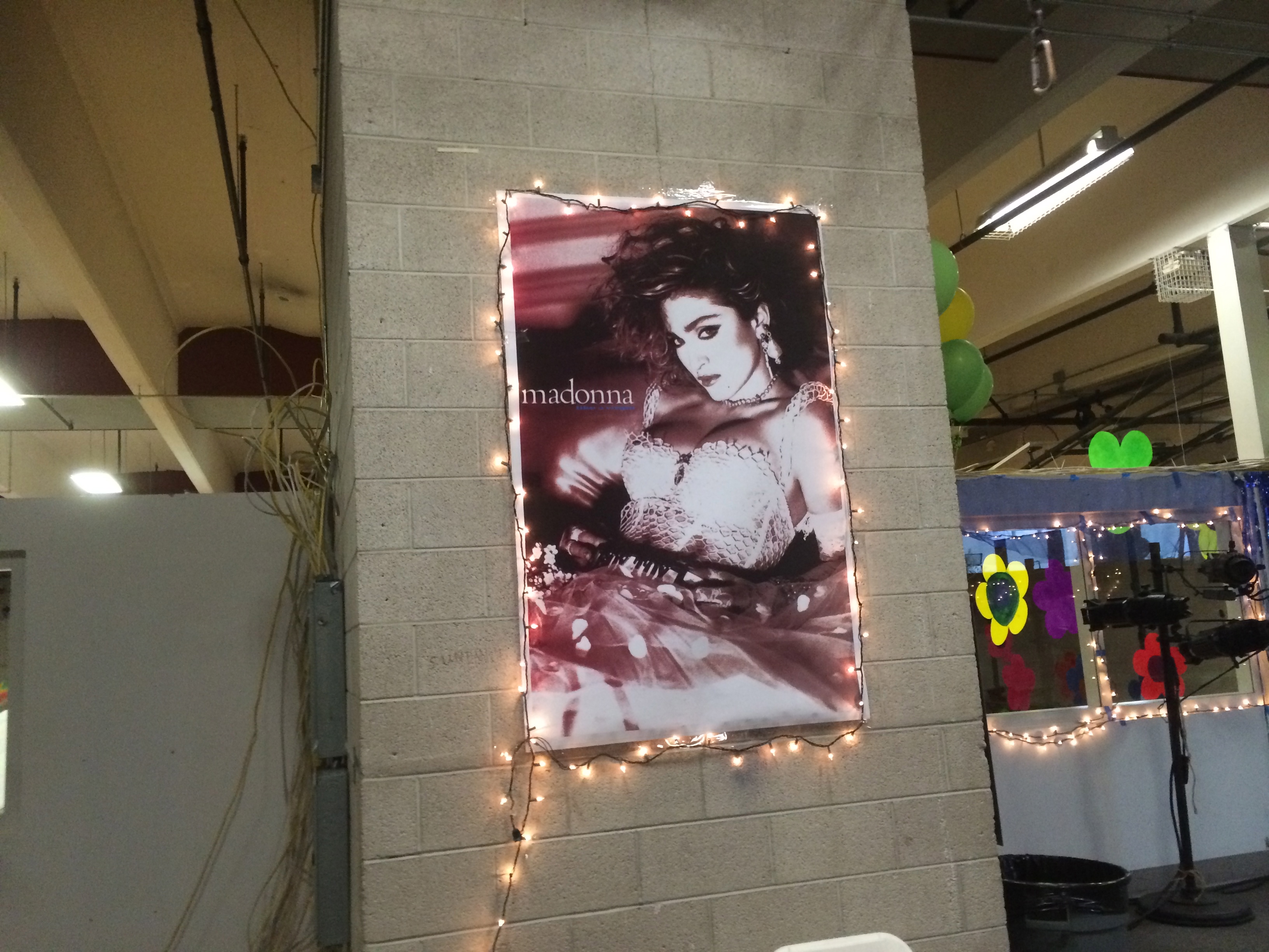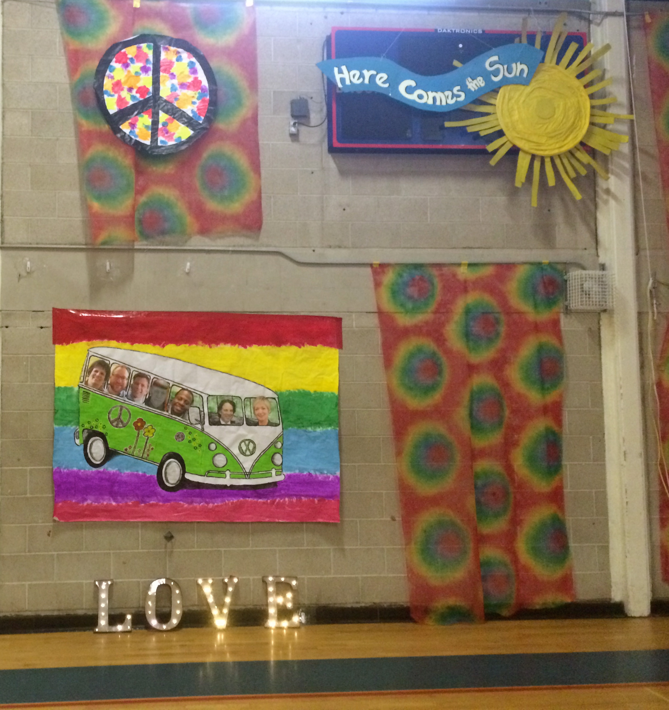 Hey, here’s why I haven’t been gratituding (I know this isn’t a word, but maybe it should be), for the last several days, I designed and implemented (I’ve been working on this for months and months, but this was the three decorating-a-thon, where we work a zillion hours to fill three gyms and an entryway) a super fun giant party for the 400 + seniors on prom night, to keep them safe and not drinking and driving, which is what I think I did on my prom night–no judging–didn’t you? Aside from all the decorations, each room gets filled with all sorts of cool stuff like a life sized twister, blow up obstacle course, airbrush tattoos, food galore, a DJ, a prize table featuring the big prize of a Mac Book Air, and loads of other stuff, too. It was exhausting, and I am bone weary. Here’s a tour of a 50’s ,60’s, 70’s, 80’s themed Blast from the Past After the Prom Party.