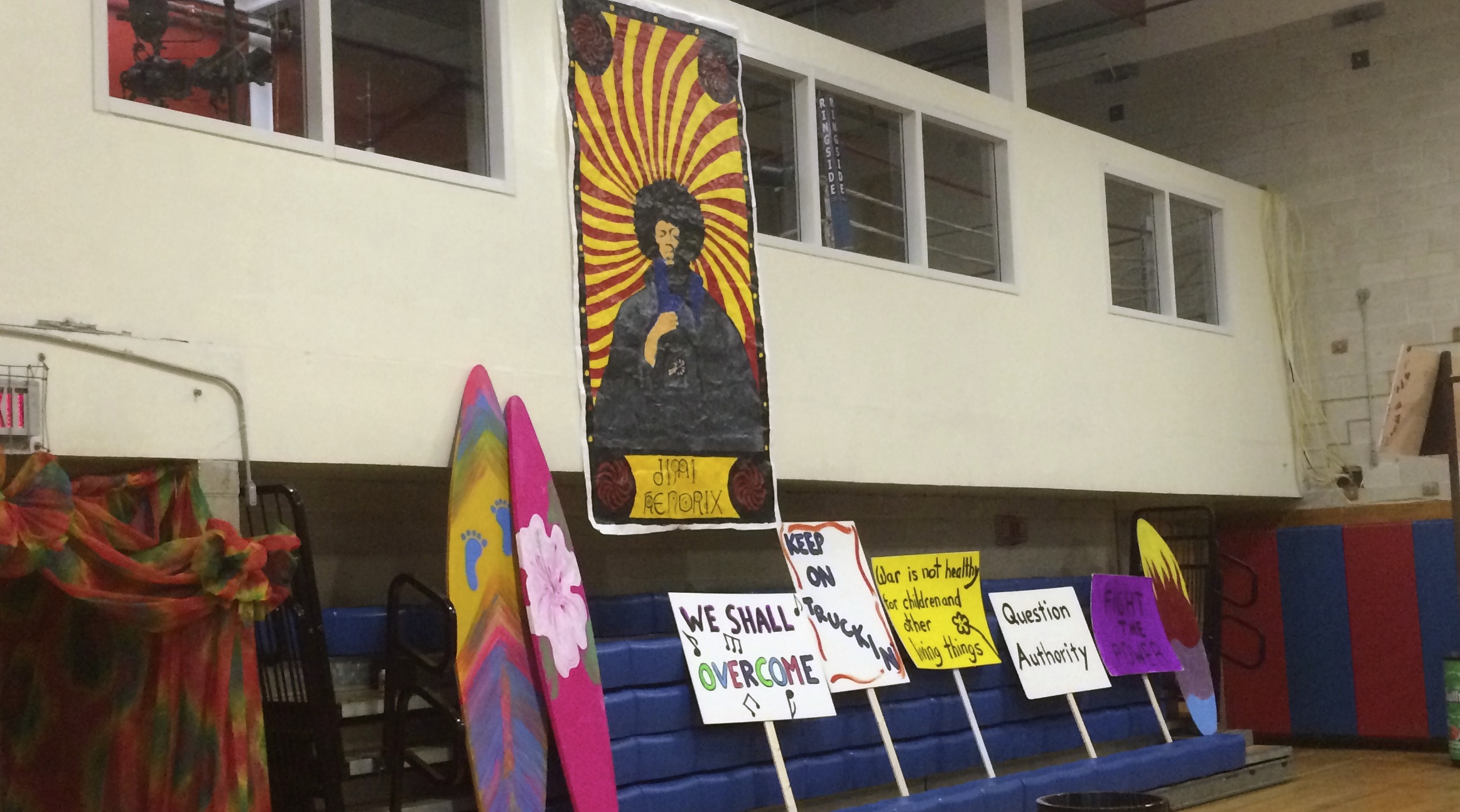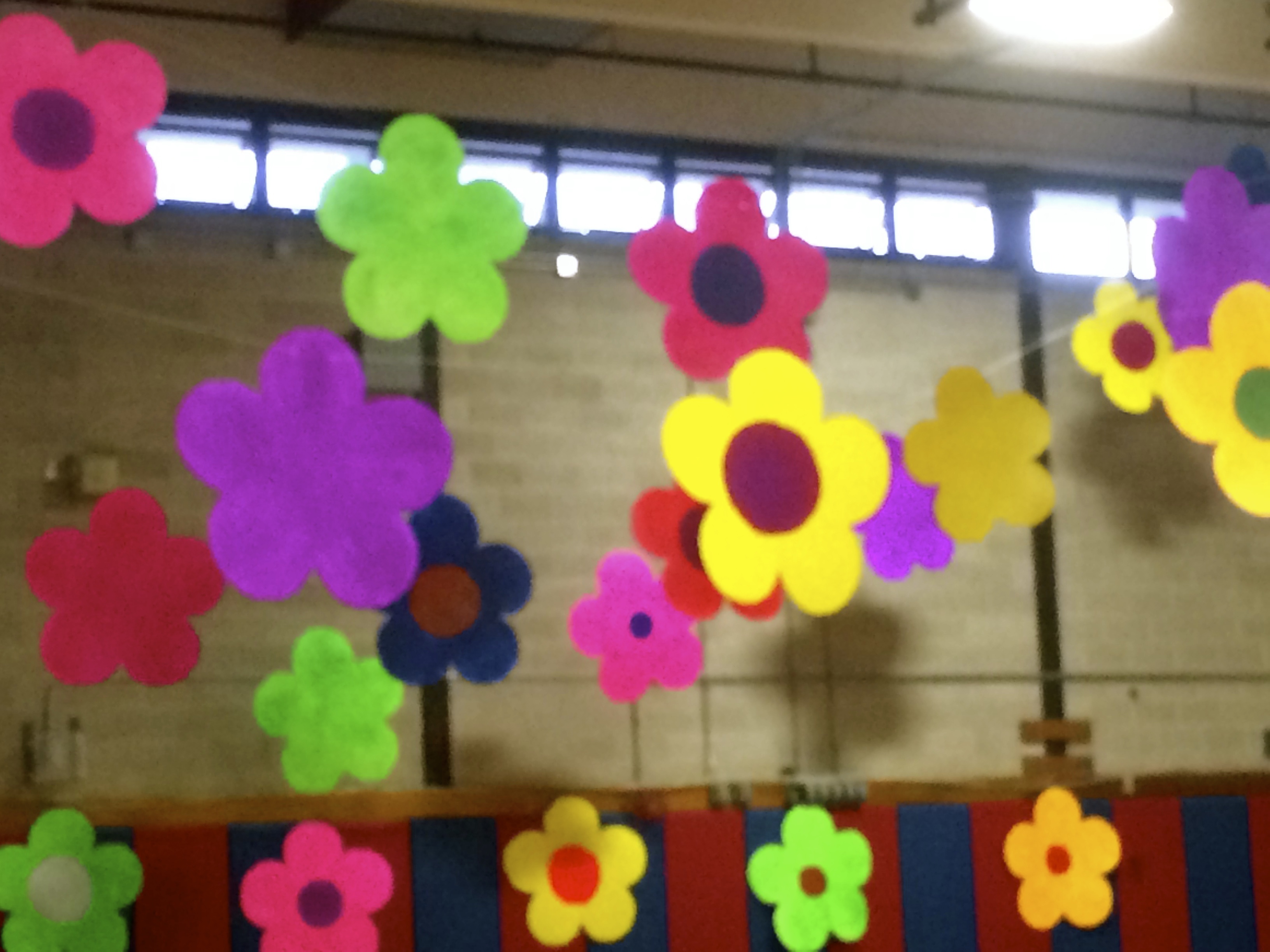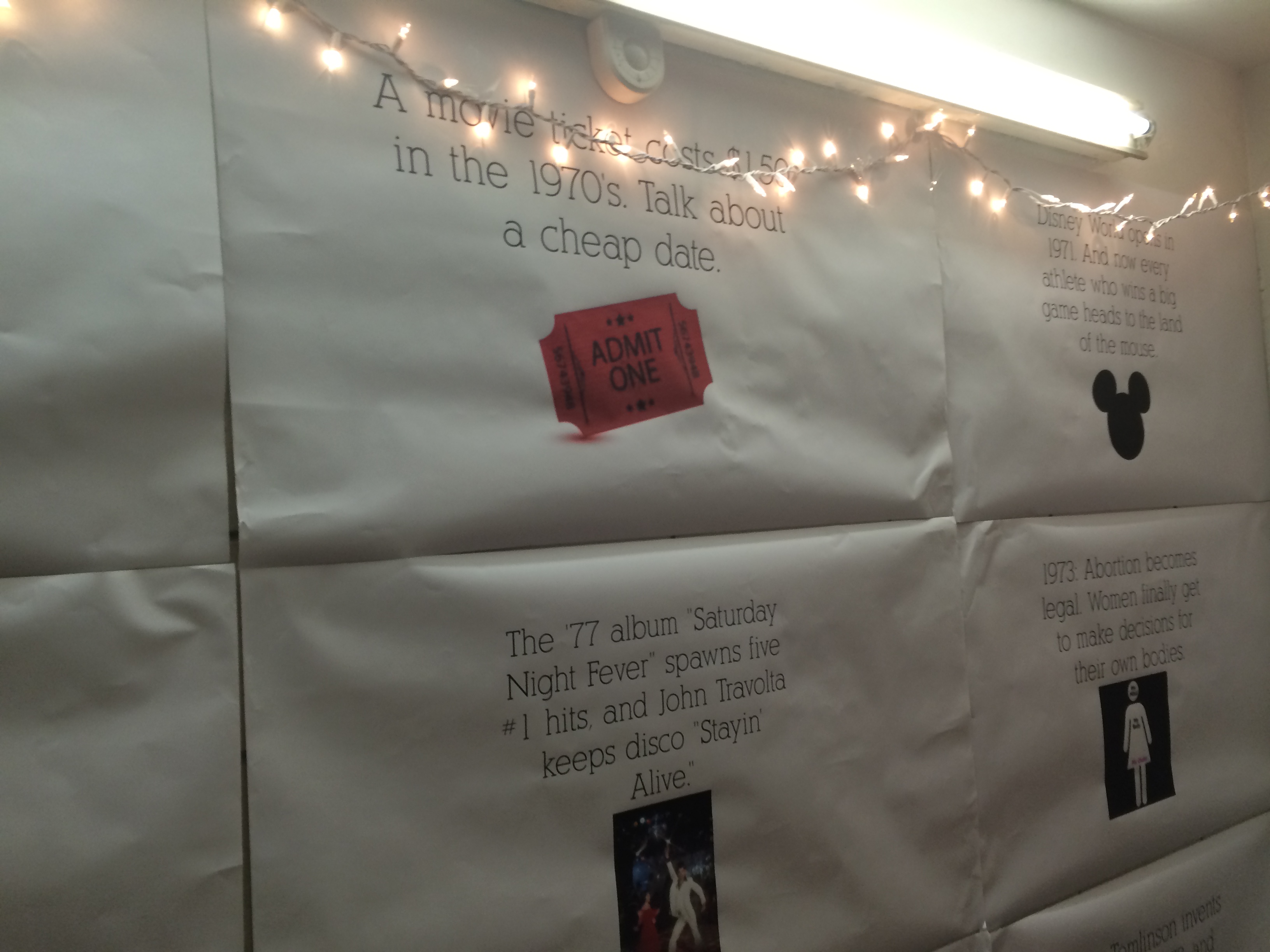 Hey, here’s why I haven’t been gratituding (I know this isn’t a word, but maybe it should be), for the last several days, I designed and implemented (I’ve been working on this for months and months, but this was the three decorating-a-thon, where we work a zillion hours to fill three gyms and an entryway) a super fun giant party for the 400 + seniors on prom night, to keep them safe and not drinking and driving, which is what I think I did on my prom night–no judging–didn’t you? Aside from all the decorations, each room gets filled with all sorts of cool stuff like a life sized twister, blow up obstacle course, airbrush tattoos, food galore, a DJ, a prize table featuring the big prize of a Mac Book Air, and loads of other stuff, too. It was exhausting, and I am bone weary. Here’s a tour of a 50’s ,60’s, 70’s, 80’s themed Blast from the Past After the Prom Party.