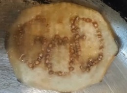 People find God in funny places. This guy found it in eggplant. (I myself often find him at the beach or when I’m eating cheese, for instance.