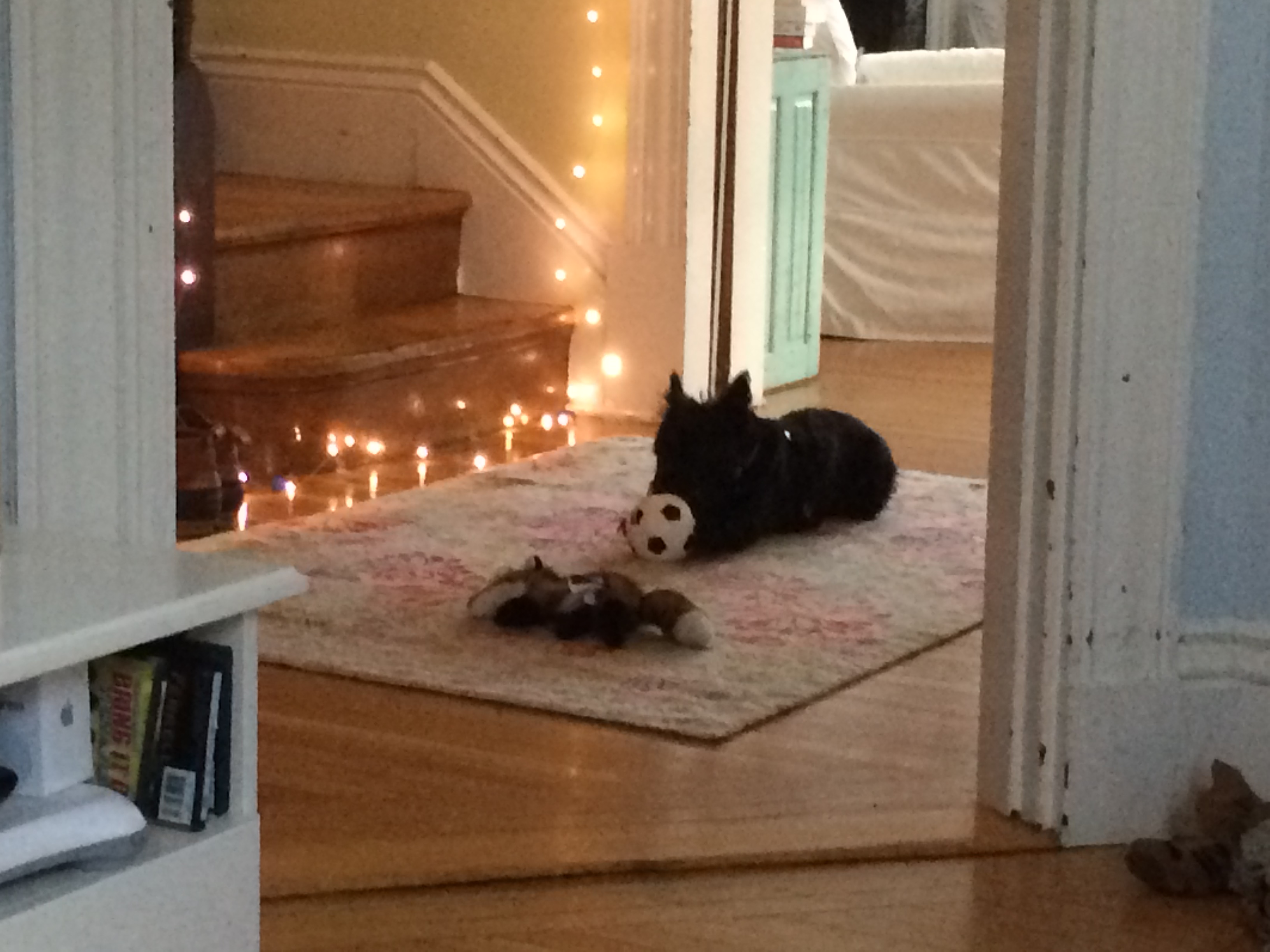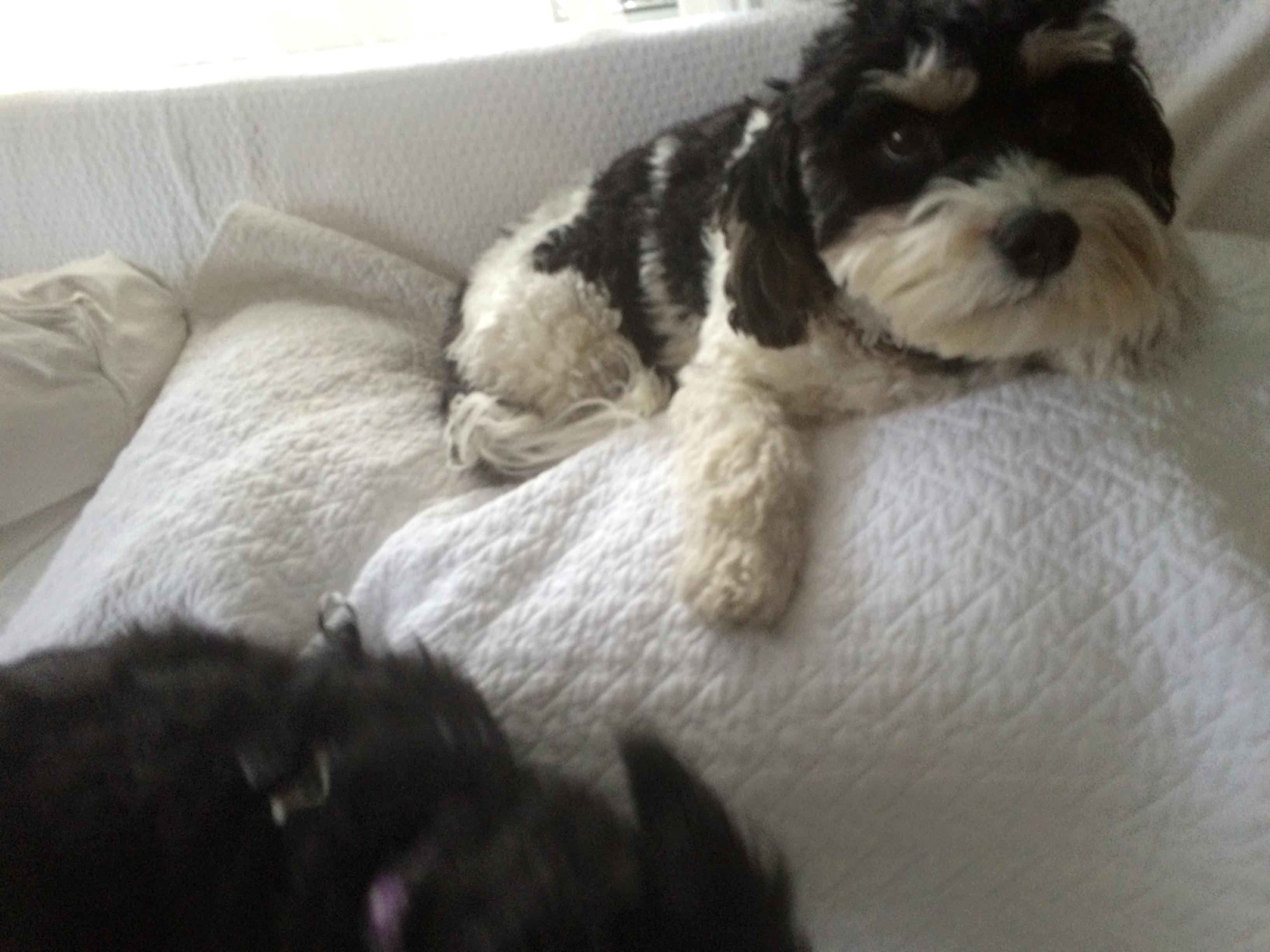 There have been some scuffles over bones, which Riley has hidden all over the house, as if he is thinking about nuclear disaster, and wants to be prepared. Half the time I’m sleeping with a rawhide chew under my pillow, or sitting on top of one when I’m on the couch. Anyway, the minute Violet arrived, he got very proprietary with his stash. But once I took all the bones and put them out of reach, the two of them seemed to do just fine.