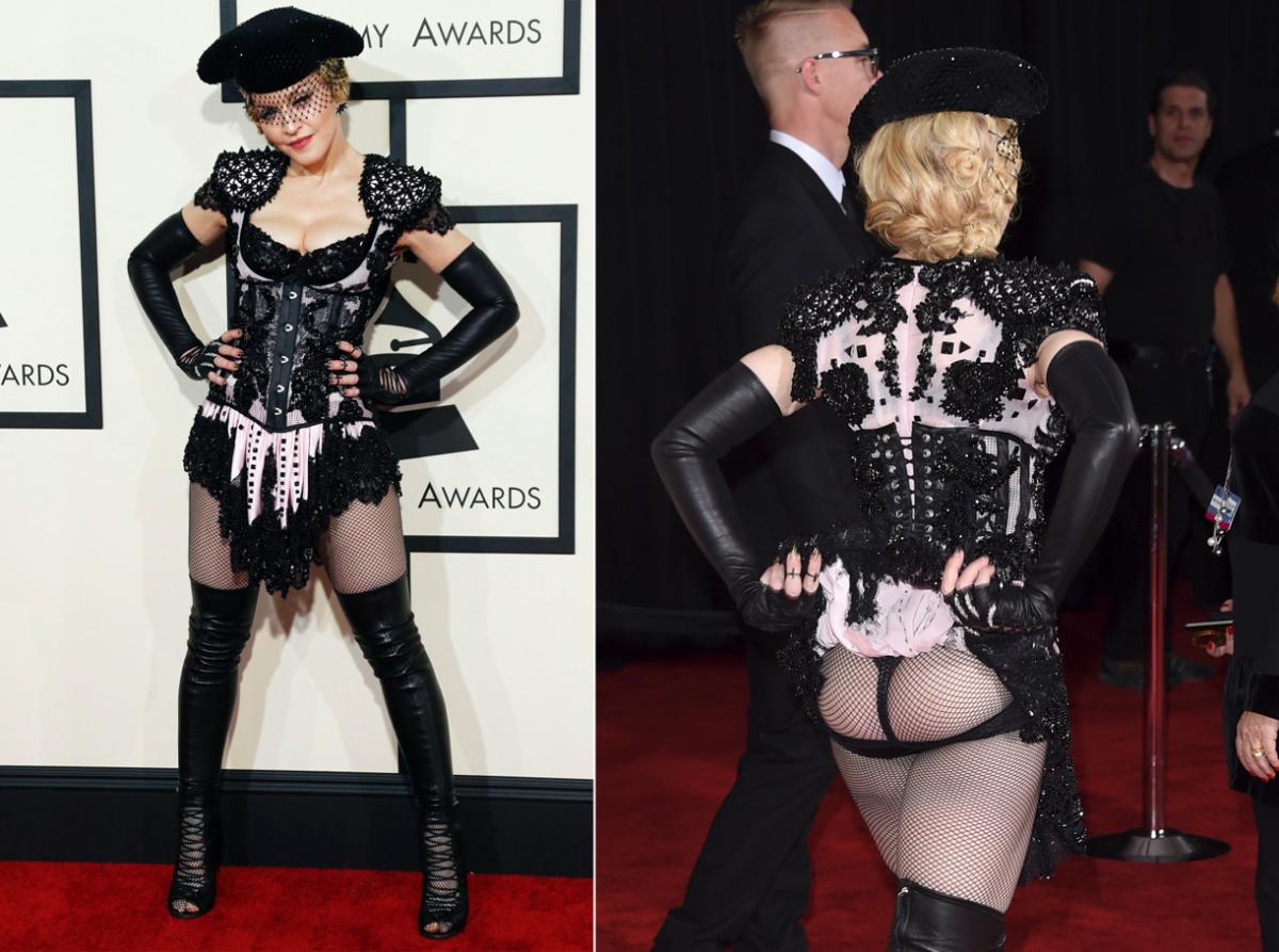 Ok, her body is banging. The girls are up and at ’em, her legs look strong, and she’s 57, BUT SHE’S 57, and she’s dressed like she’s in the Ferdinand book I used to read my kids. It’s the Grammy’s, not the running of the bulls. (Note to self: buy ass-hoisting garment next time you’re at Bloomingdale’s ass-hoisting garment section.)
