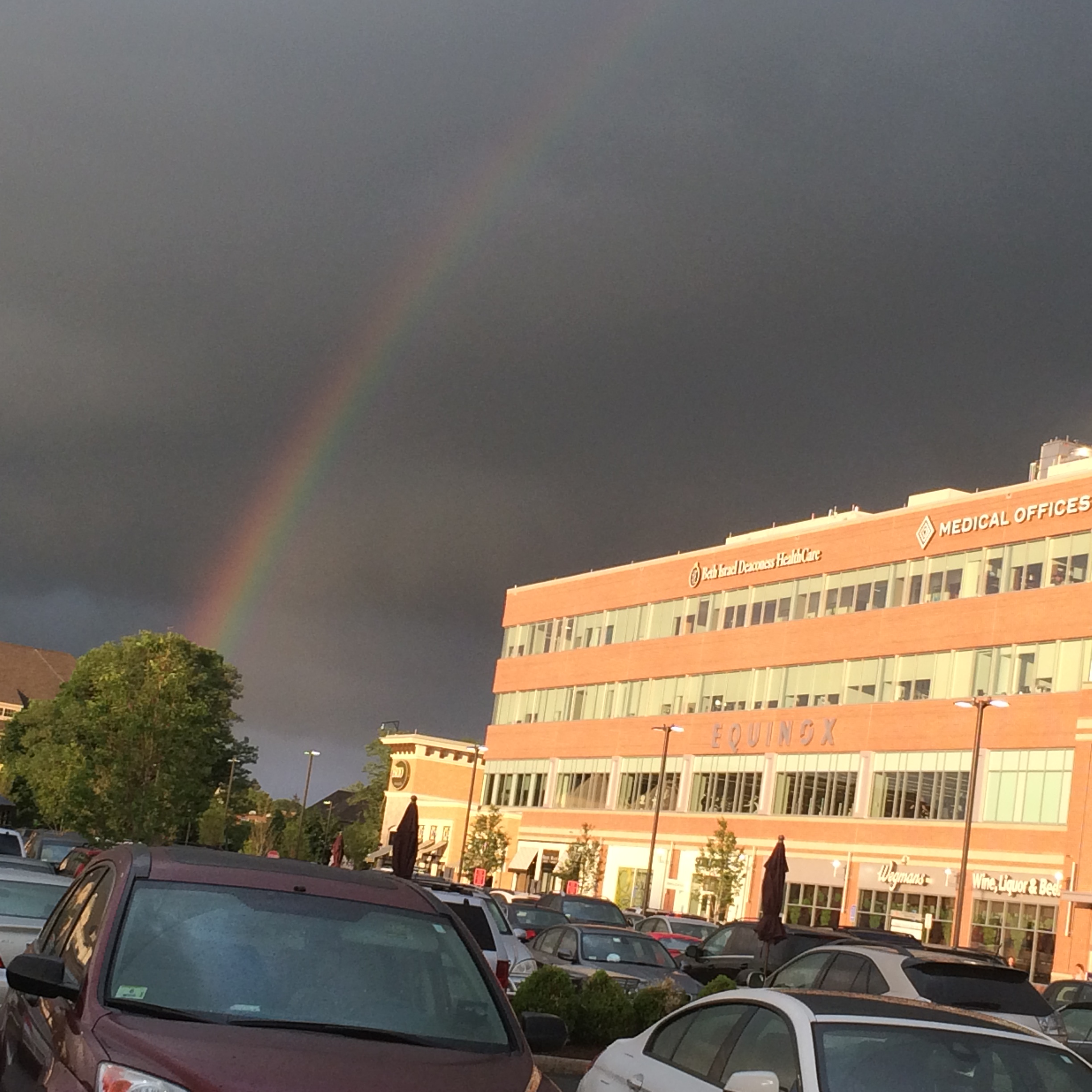 Yesterday Ally and I had to go to an appointment in Lexington. When we walked in, it was cloudy, when we walked out, we were in a downpour of every raindrop that has ever lived. We got on 128, where I could hardly see out of the windshield. I was clutching the wheel like it was a piece of Italian bread. The sky was a shape shifting dark gray and black, with peeks of sunlight coming through. About 15 minutes into our drive, a rainbow appeared. I am completely and utterly fascinated by rainbows, for their incredible beauty, but also for their symbolism. Anyway, this rainbow got thicker and bigger and brighter as we drove, and I was literally screaming about how crazy it was. Then it doubled. There were two. I was trying to snap pictures out my window (not a good idea while behind the wheel in sheets of rain), but I really wanted to get a recording of this event, because seriously, it was OUT OF THIS WORLD STUFF. TOTALLY OTHER- WORLDLY. And the light, the light was just crazy beautiful. I’m telling you if God himself popped up in the sky with a thought bubble saying “Look what I can do”, I wouldn’t have been any more shocked at what I was seeing.