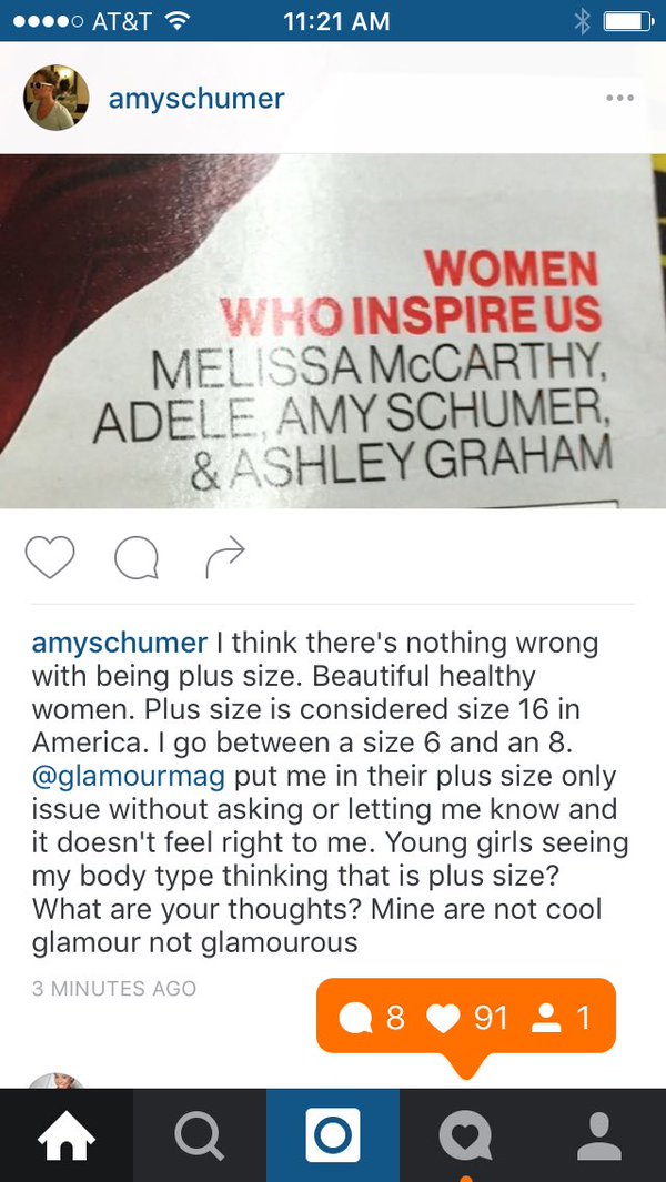 The Amy Schumer vs. Glamour mag. debacle. Seems Glamour did a  Plus-size issue, and put Amy’s name on the cover. Amy made a fuss, because she says plus-size is considered size 12 and up and she is a 6-8. On the surface you might think Amy is whining about being considered plus-size, but really what she’s saying is if a 6 or an 8 is now plus size, what message are we sending to our girls?