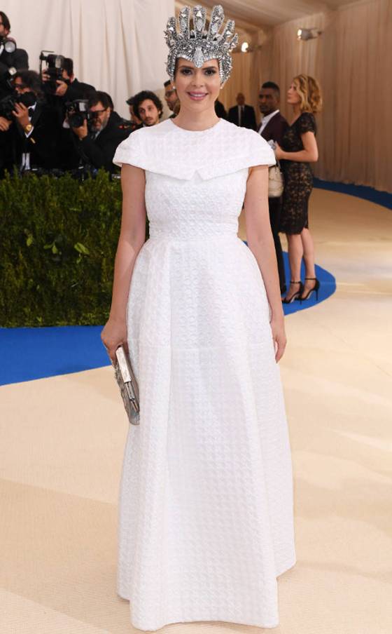Without the diamond encrusted alien headpiece, this dress is a snooze. In fact, it’s from the Land’s End wedding dress line, if they had a Land’s End wedding dress line. But the hat/crown/karated combat helmet from the Game of Thrones fashion vault elevates this look into classically ugly Met Gala gear. I don’t even know.